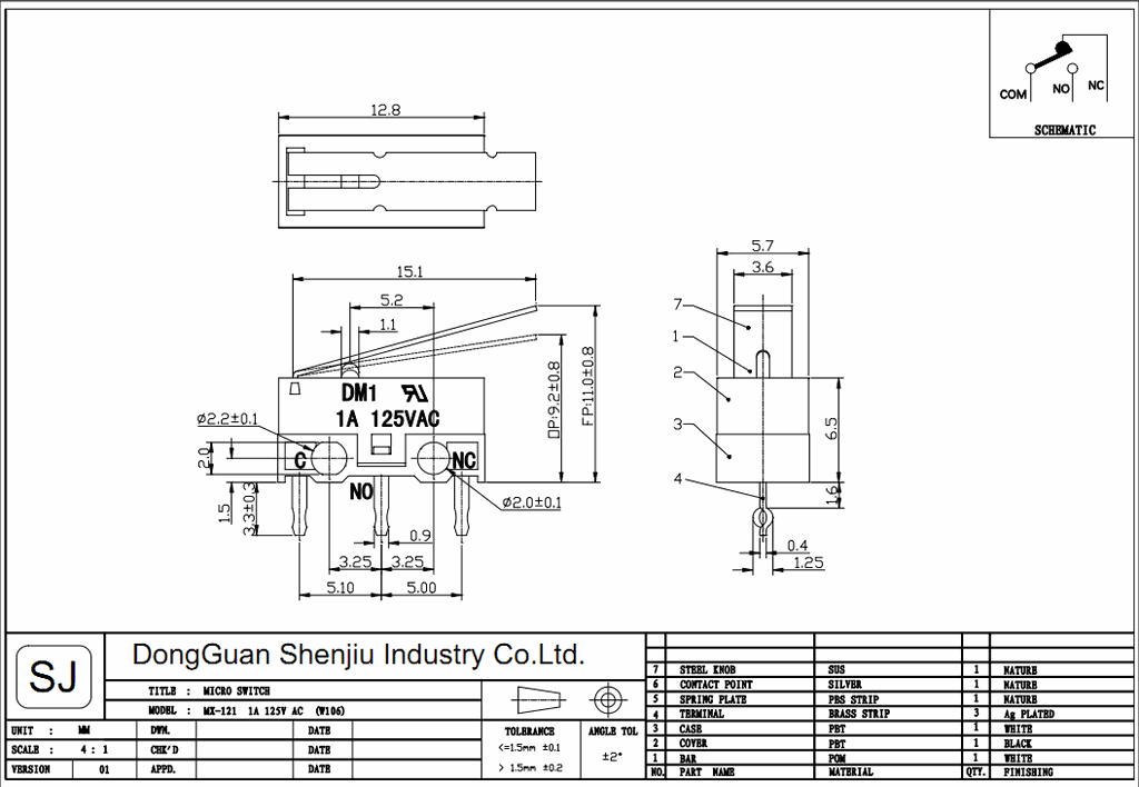 微动开关Micro Switch、压接微动、三脚带直柄行程微动开关MX-121
