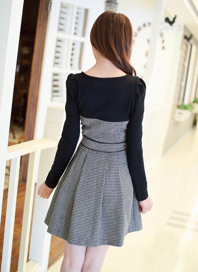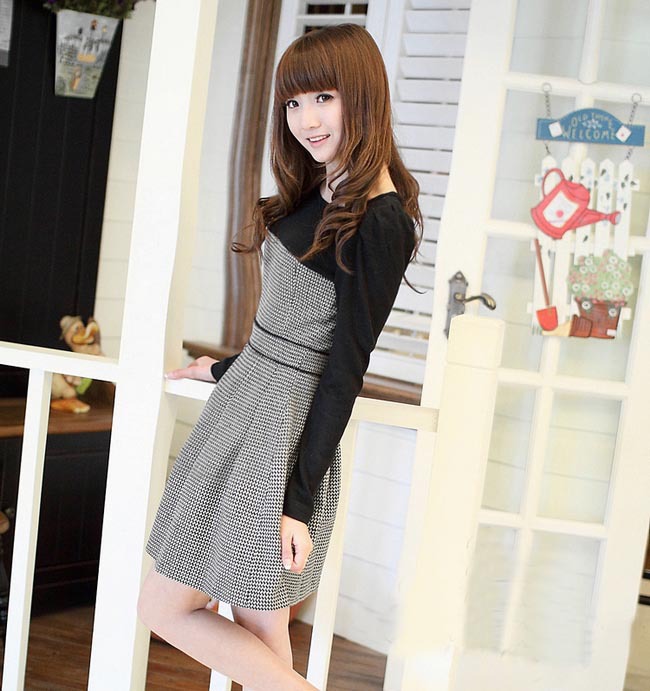 13新春冬款韩版时尚修腰显瘦可爱格子拼色毛呢打底连衣裙FZ2642