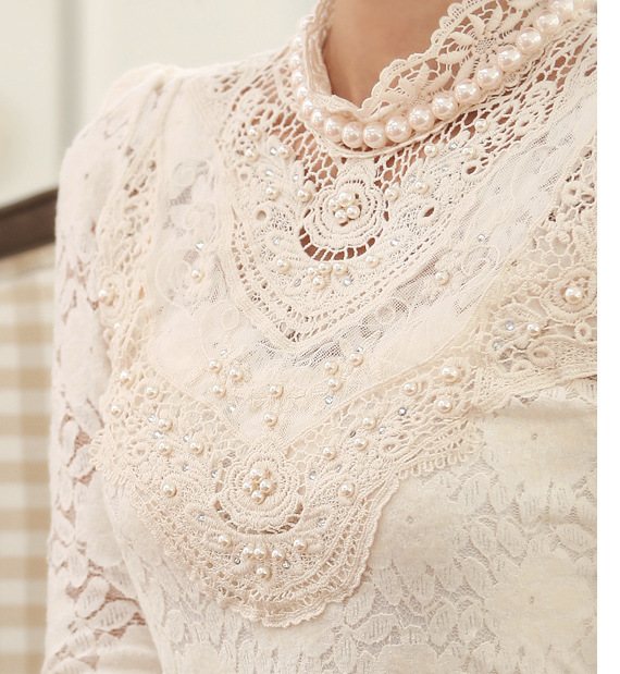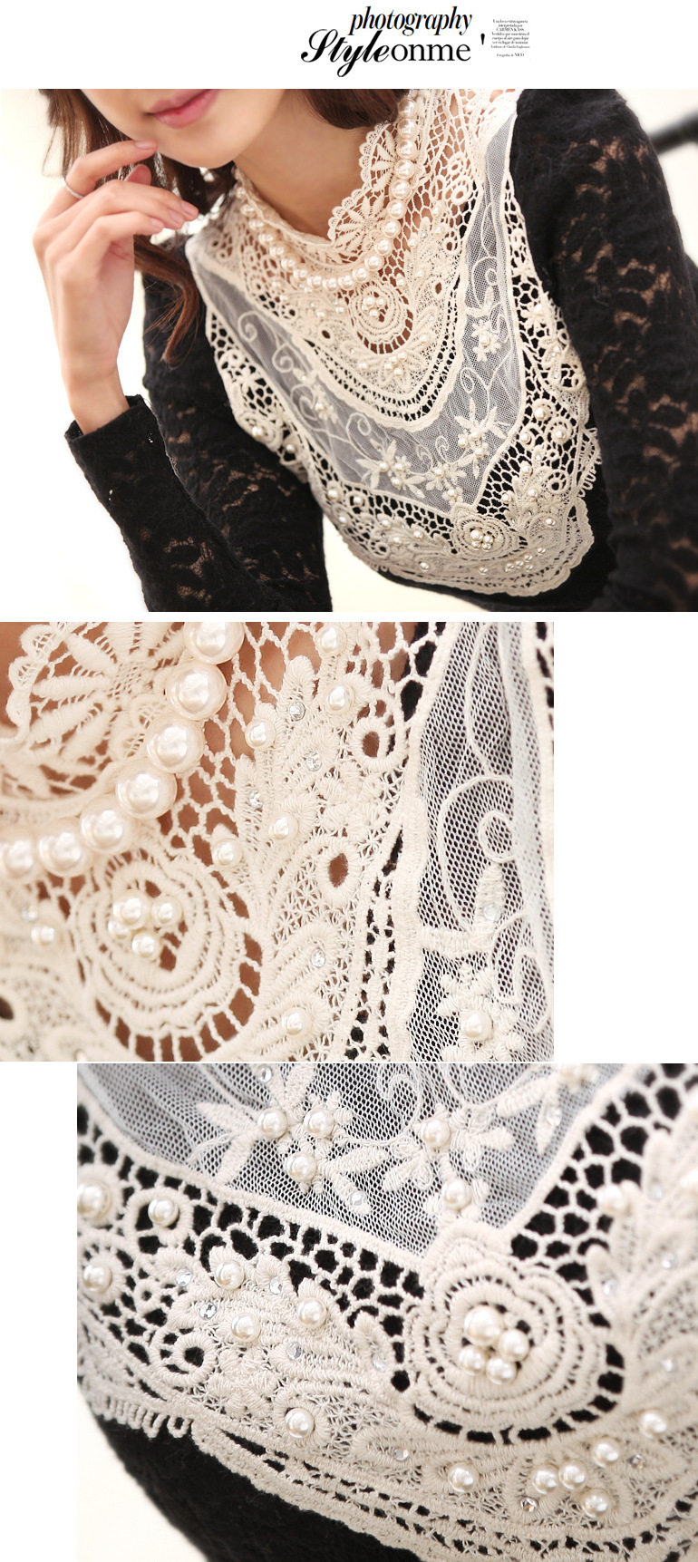 爆款 2012珍珠镶嵌高领勾花蕾丝修身百搭女式 打底衫长袖W084