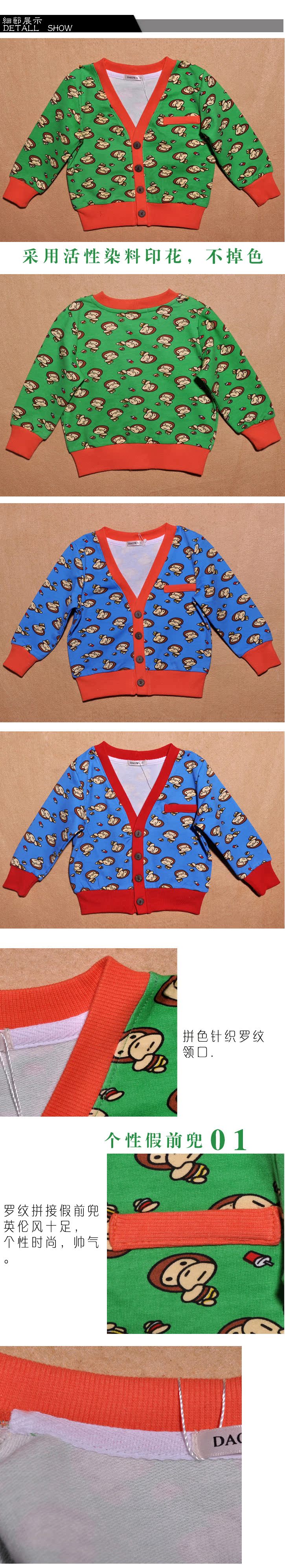 韩版新款 纯棉毛圈大嘴猴儿童长袖 秋季新款儿童外套批发1A4512