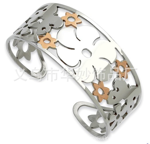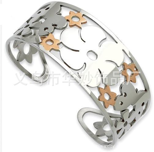 低价批发钛钢镂空蝶恋花图形手镯 玫瑰金挑色宽大不锈钢手镯手环