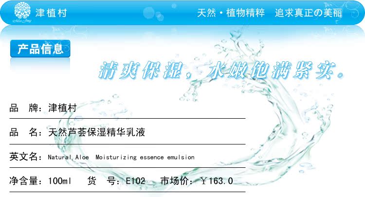 招商供应 津植村天然芦荟保湿精华乳液 代理免加盟费