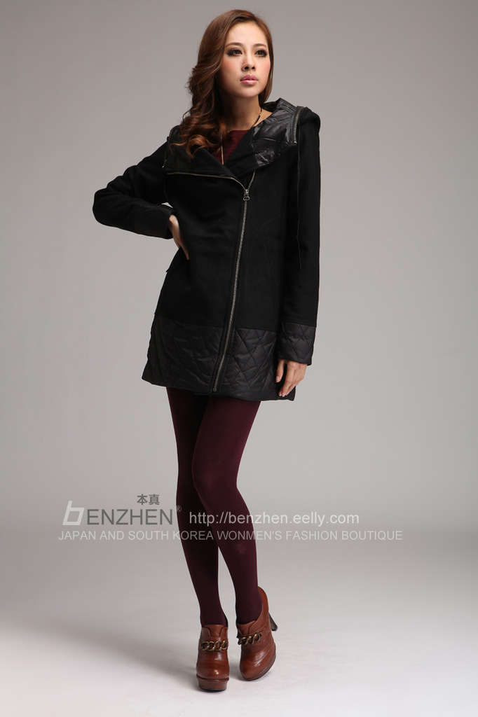 轩言韩版修身翻领斜拉链毛呢外套 305