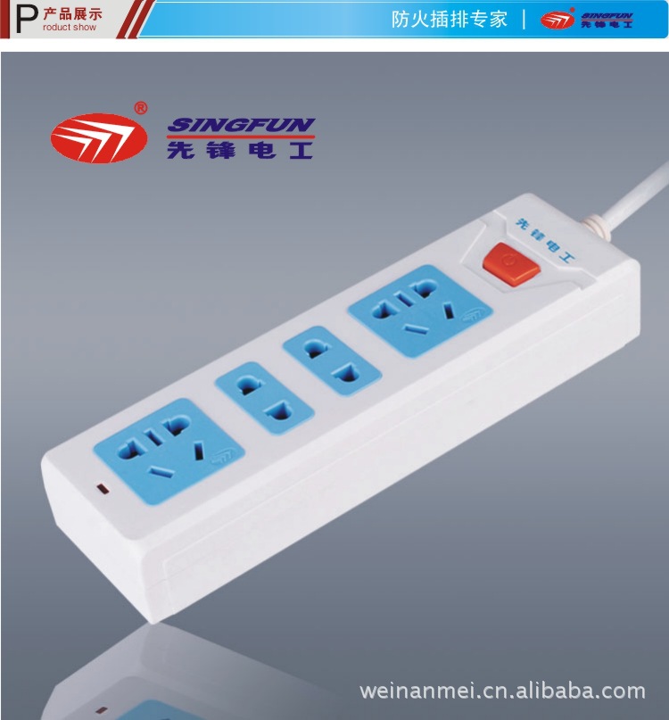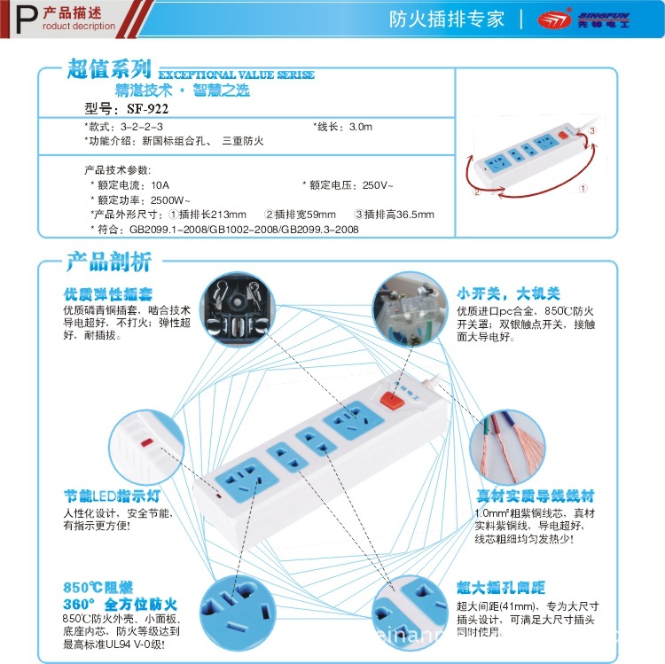 先锋插座超值系列 SF-922 1.8米1.0mm 三重防火 新国标 插排插板