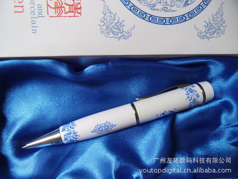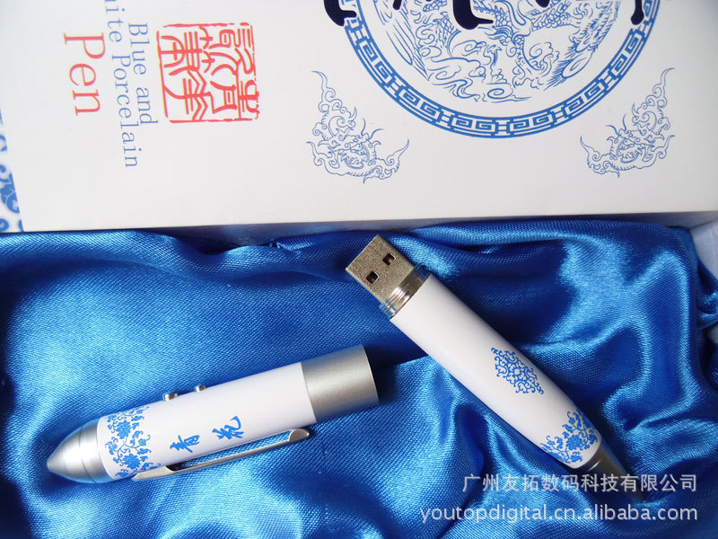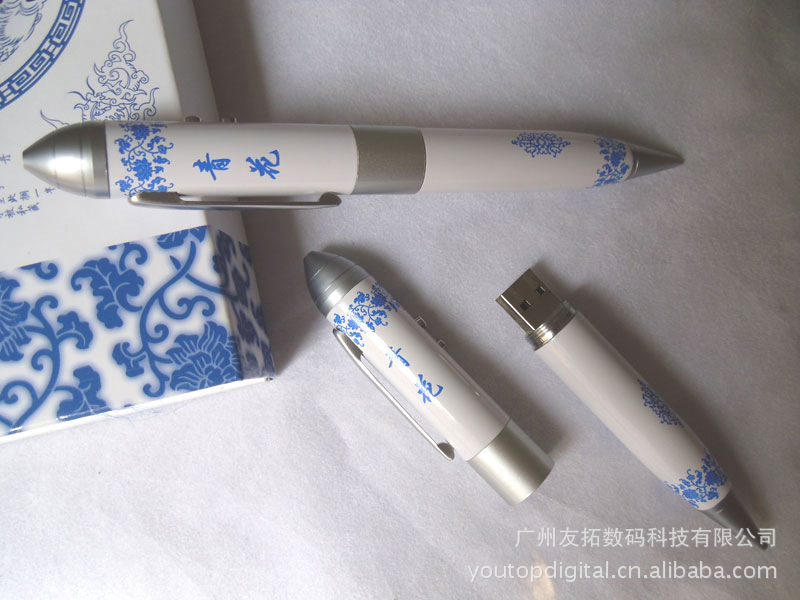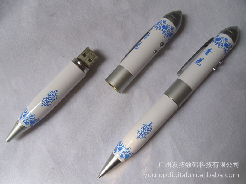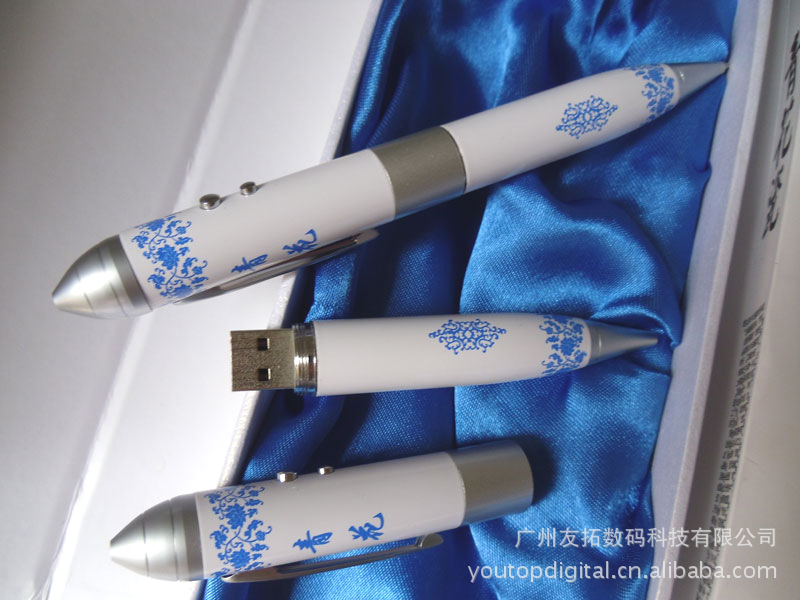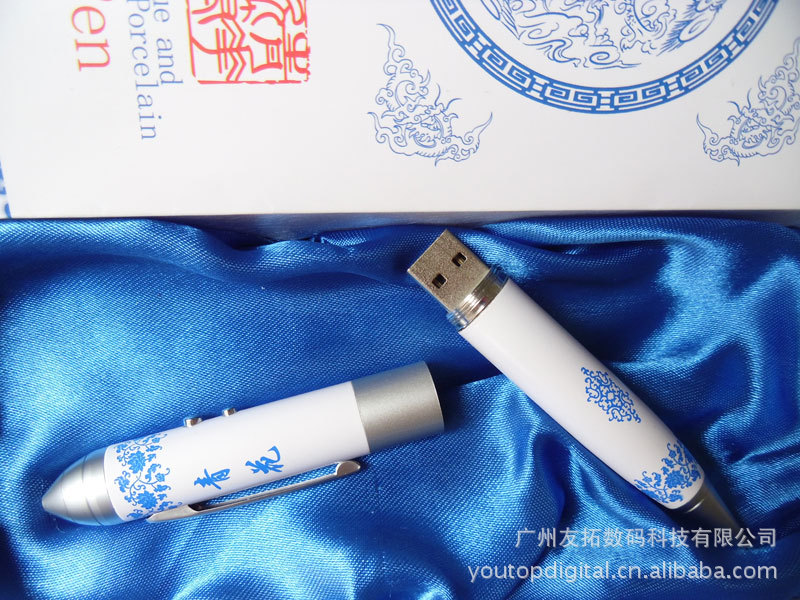 精美笔式U盘 多用U盘 激光照明双灯青花U盘笔