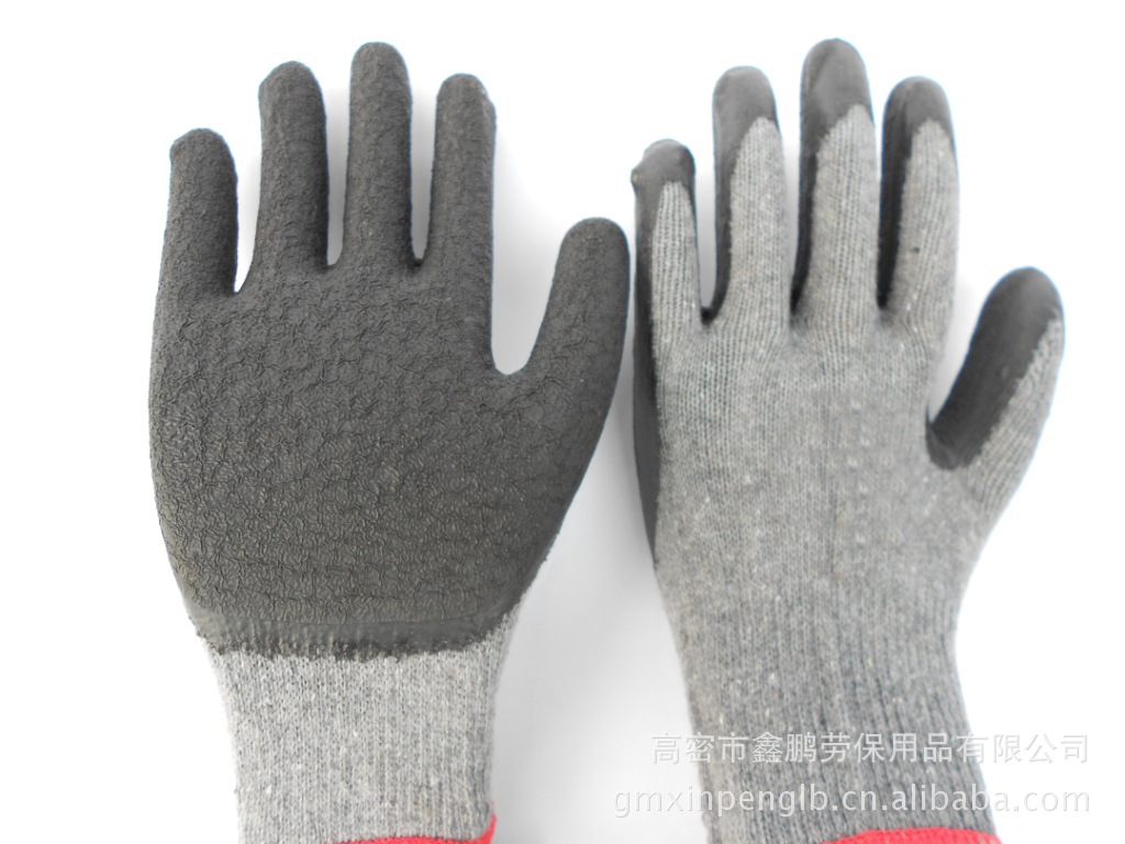 厂家直供优质 劳保手套 十针起绒(拉毛)红纱黑胶皱纹挂胶手套