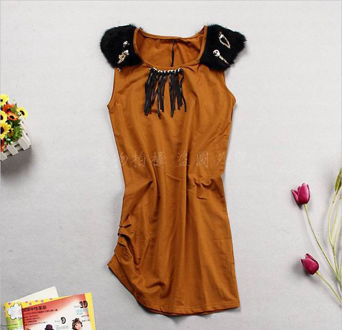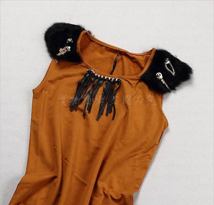 韩版 伊可唯9653 肩真毛无袖长T恤