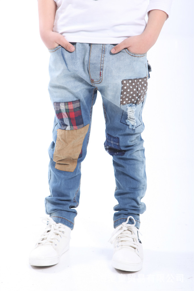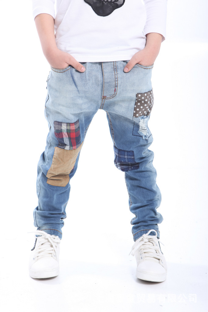 磨砂破洞补丁儿童牛仔裤 新款儿童牛仔哈伦裤 拼接图案童垮裤