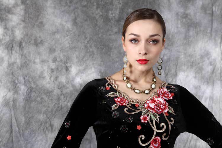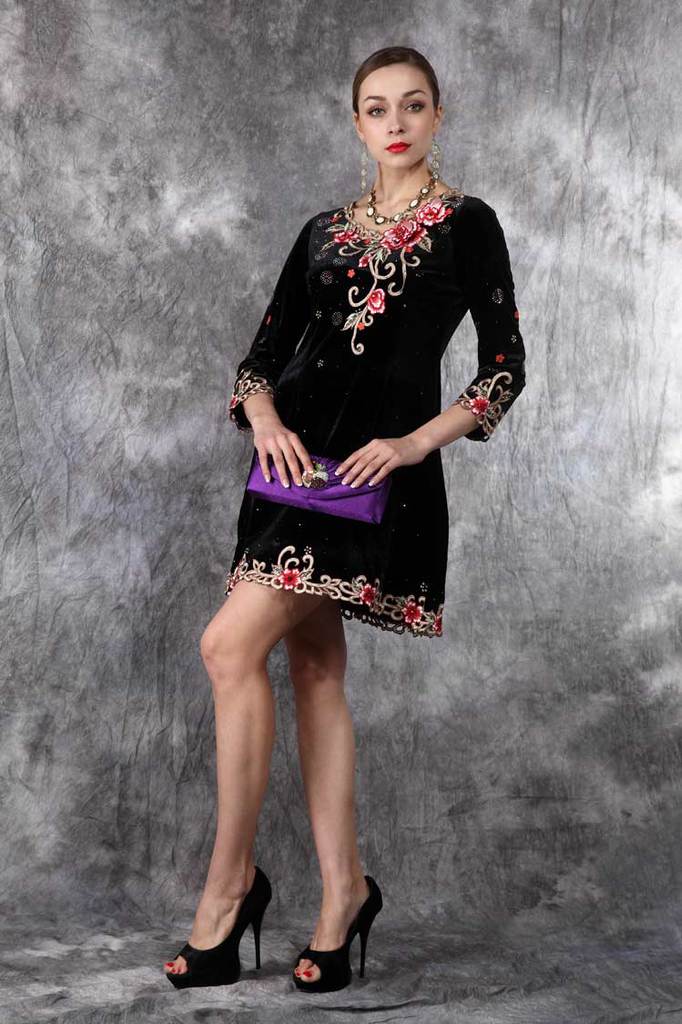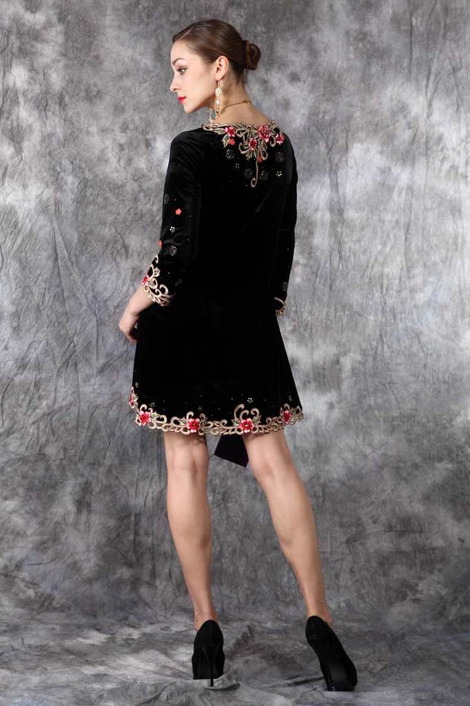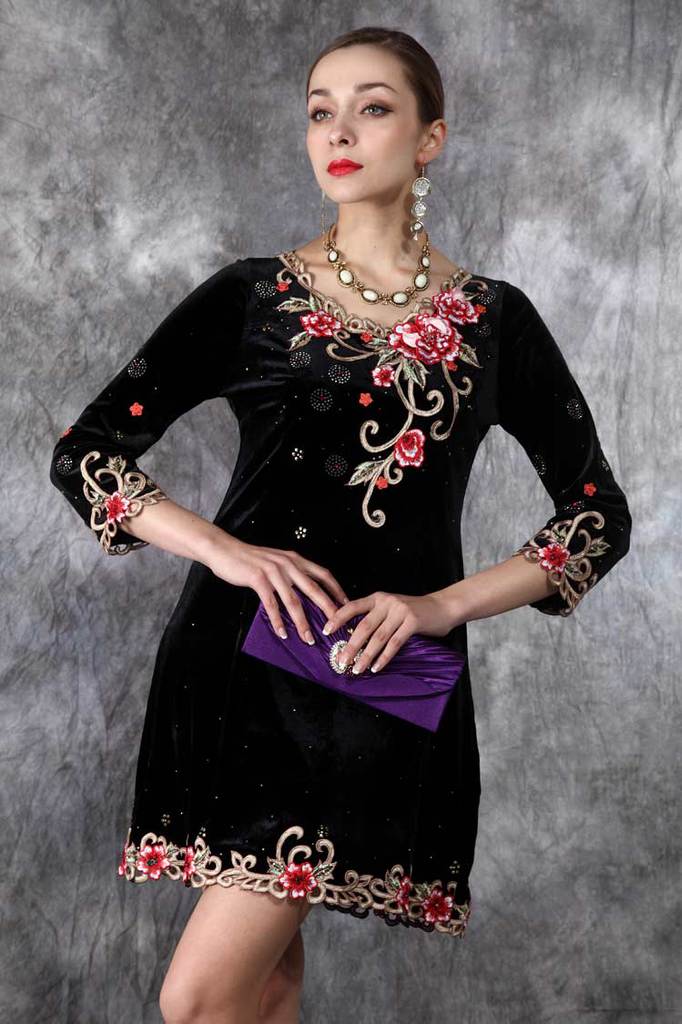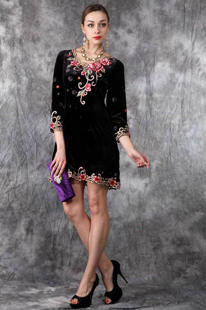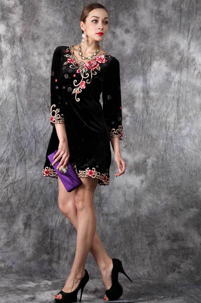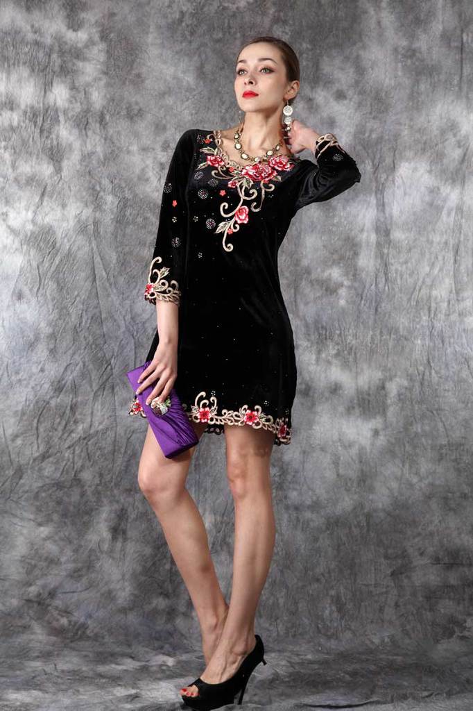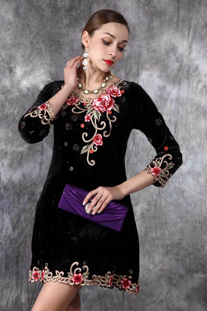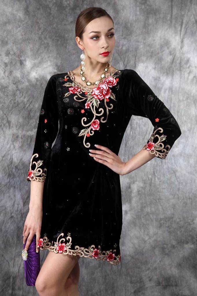 外贸原单秋冬新款打底长袖丝绒连衣裙欧美立体刺绣女装批发#2201