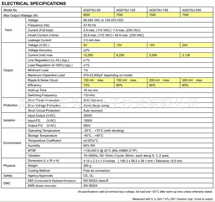 台湾ARCH翊嘉 AQS75U系列高频开关电源模块电源
