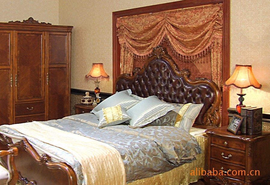 厂家直供 欧美古典卧室家具 床头柜 衣厨 妆台 实木真皮床898-01B