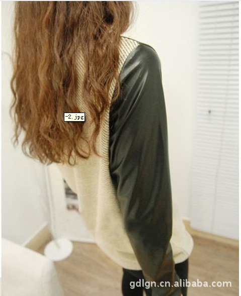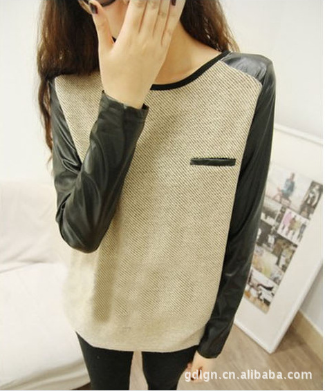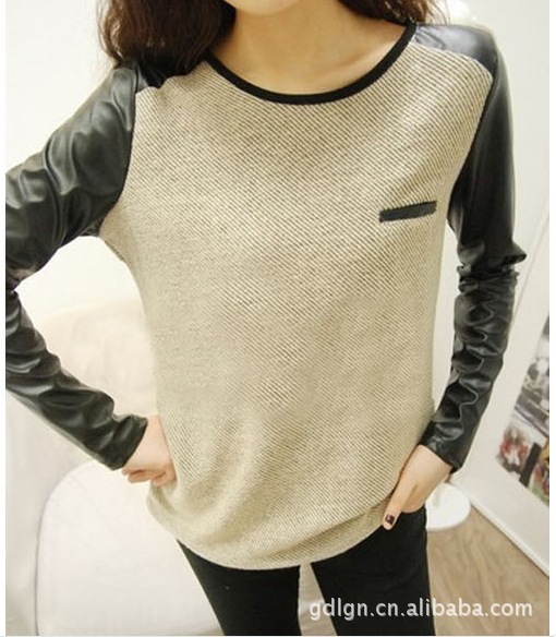 厂家供应2013新款韩版 雪花棉拼皮袖 百搭棉T恤 打底衫长袖