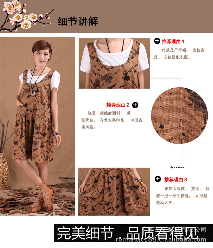 洼达蓝妮女夏装新款纯麻面料吊带背心女裙水墨圆领连衣裙F12-019