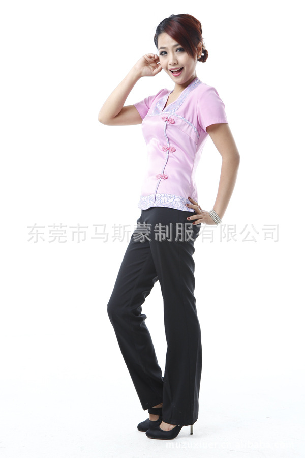 粉色唐装风格足疗按摩服,足浴保健场所工作服装