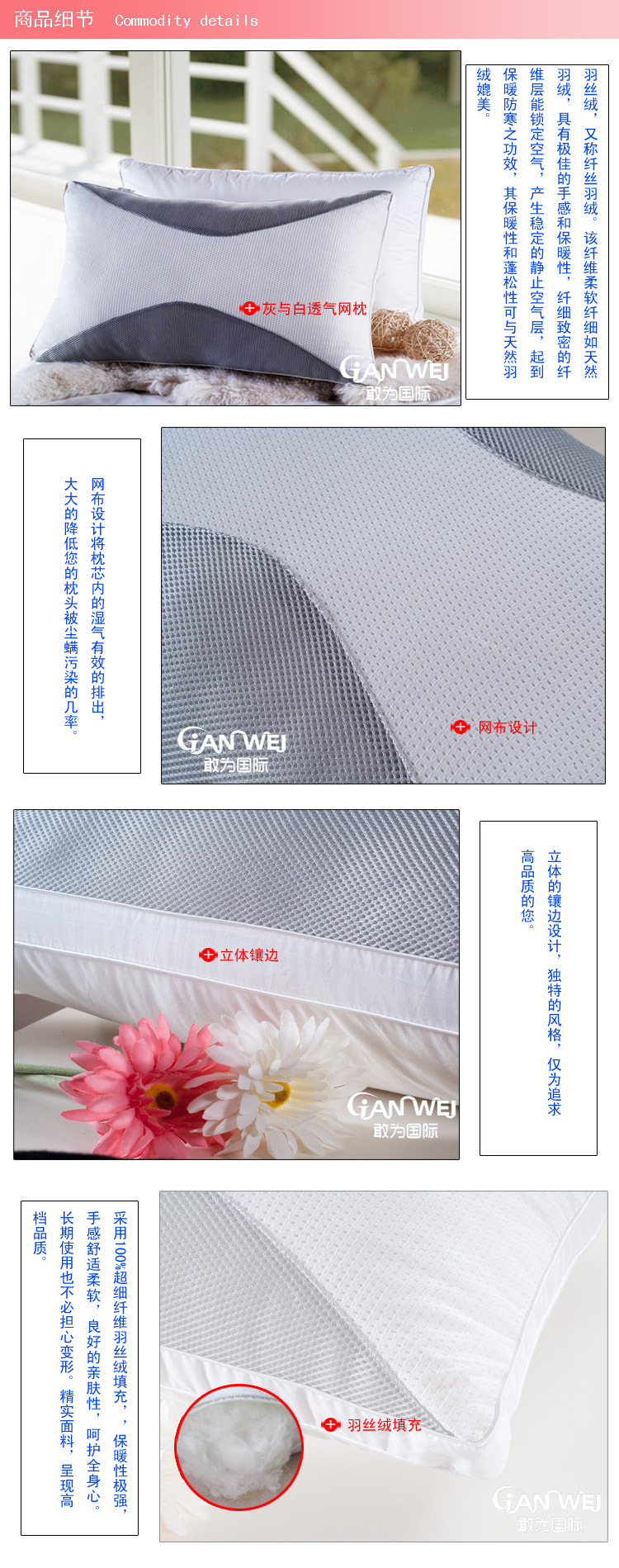 家纺批发 枕头芯 灰与白透气网枕 羽丝绒枕 舒适纤维枕 48*74cm