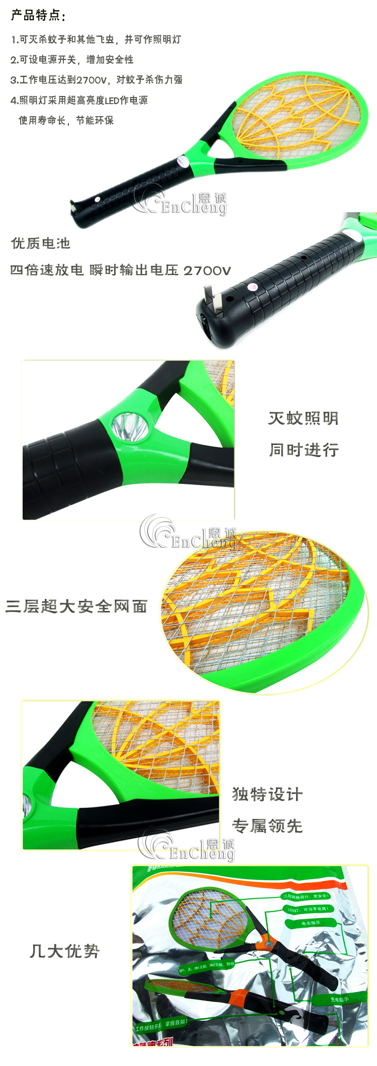 波腾BS-085充电式强力电蚊拍 安全多功能灭蚊拍 苍蝇拍带LED灯