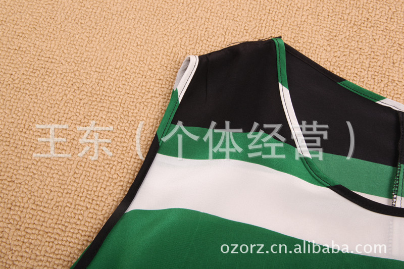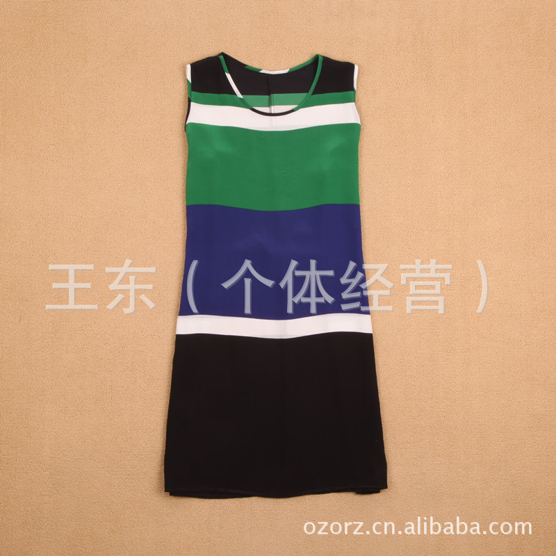 欧美外贸原单面料 蓝绿撞色条纹圆领系腰带无袖真丝背心裙连衣裙