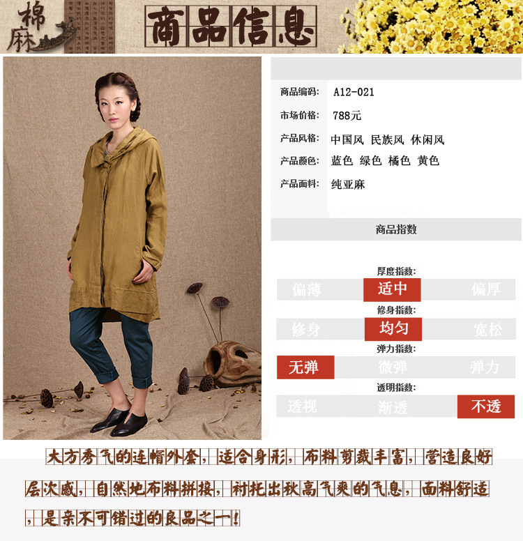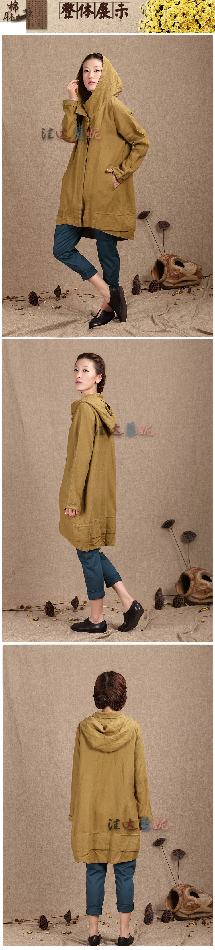 洼达蓝妮2012秋装新款纯色绣花连帽外套 纯亚麻宽松大码外套 特价