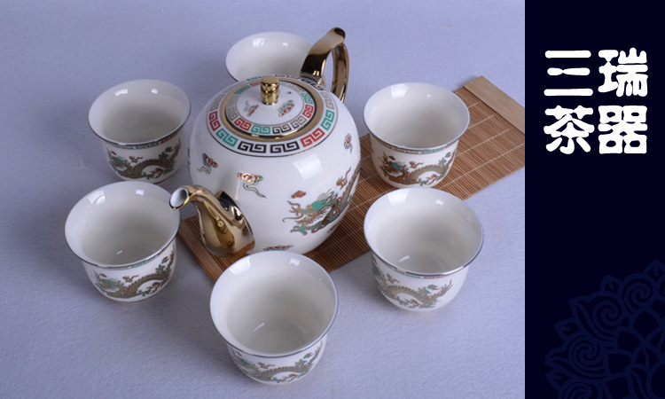 三瑞良瓷 厂家直销 金龙蝴蝶壶茶具 彩镀金龙陶瓷茶壶茶具