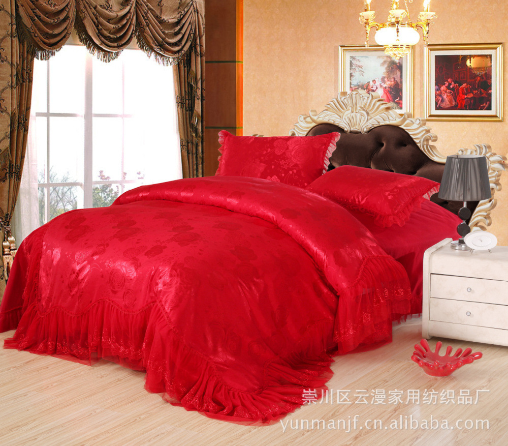 婚庆四件套 韩版丝绵大提花仿真丝四件套 蕾丝边荷叶边四件套批发