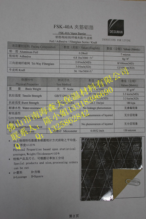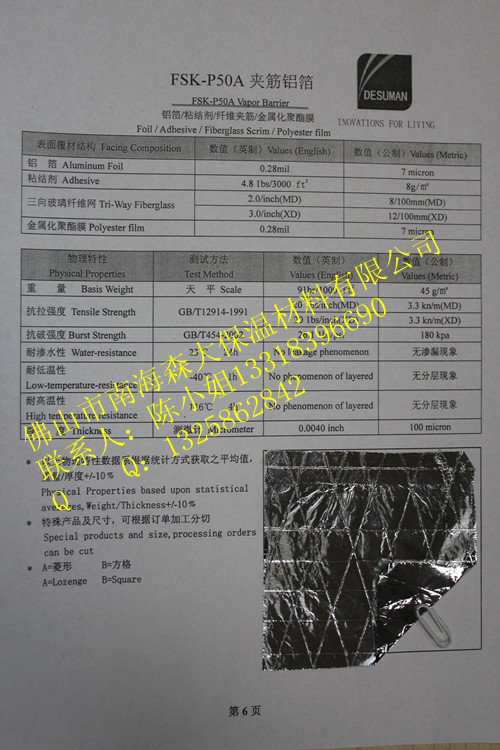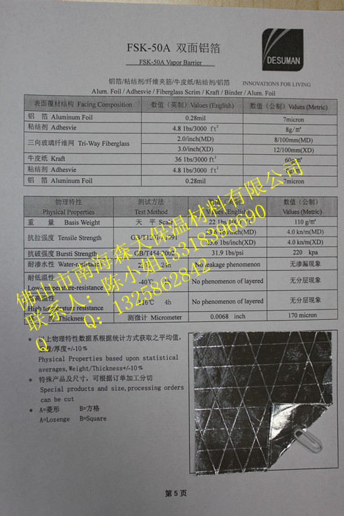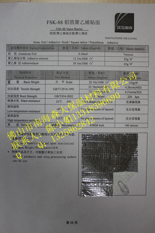 专业供应铝箔贴面 玻璃棉铝箔贴面FSJ-30A 质量保证厂家直销