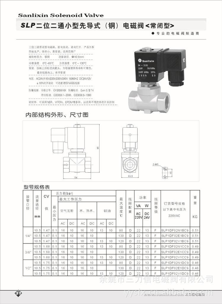 SLP二位二通小型先导式(铜)电磁阀 常闭型