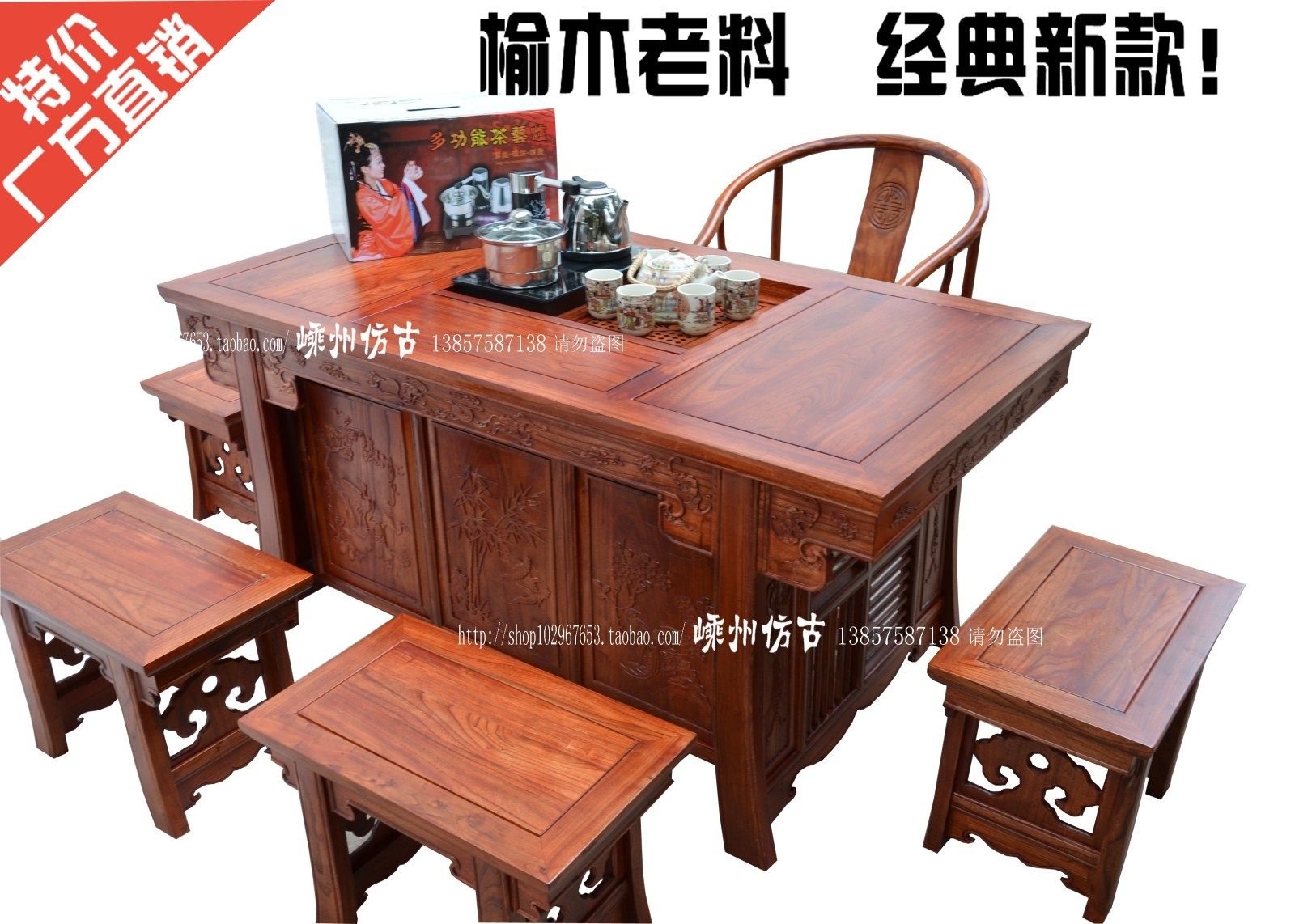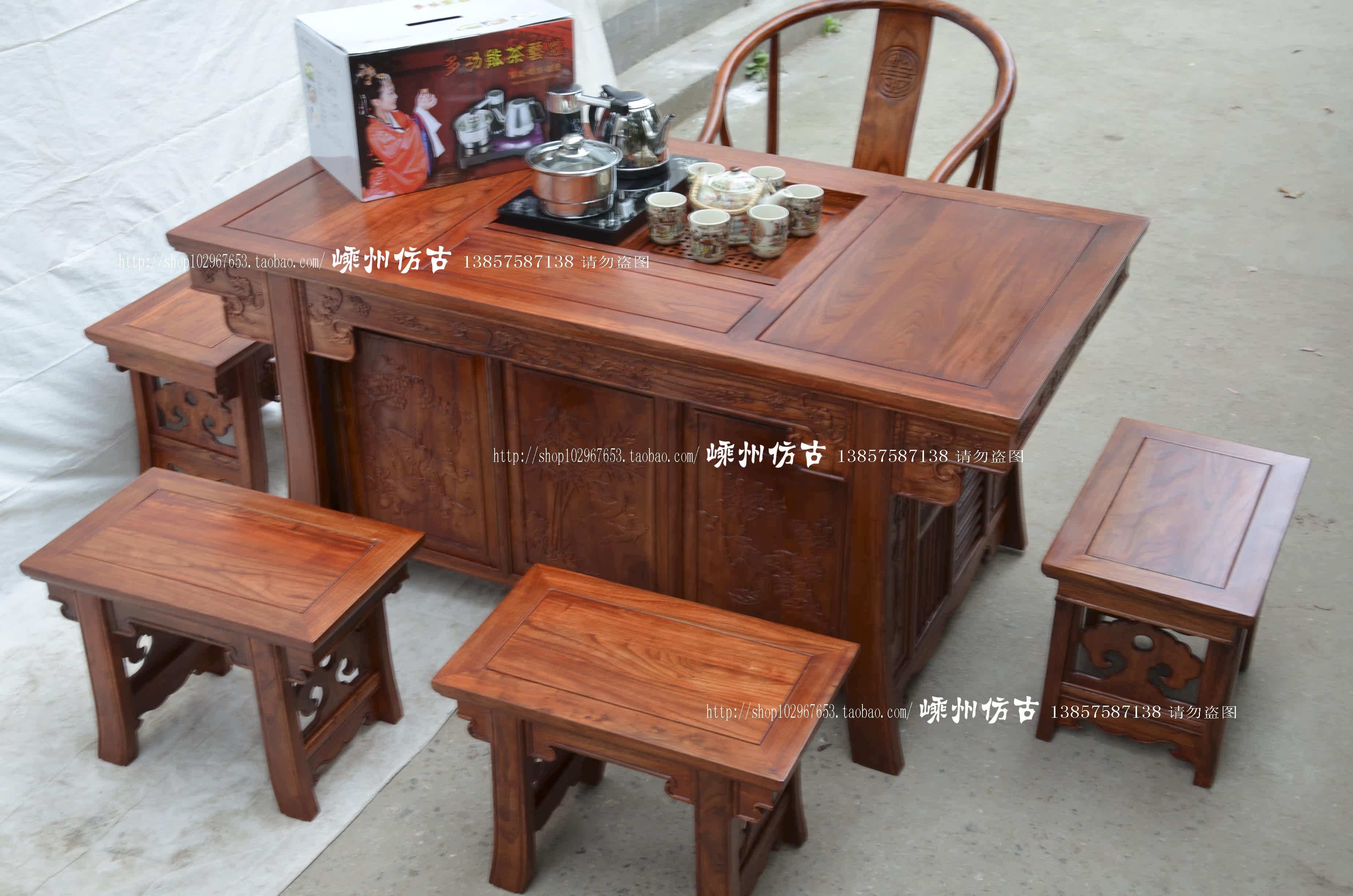 明清仿古实木雕花茶桌 茶艺桌 功夫茶桌 仿古家具