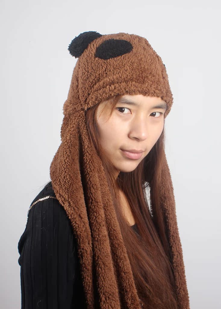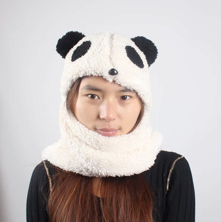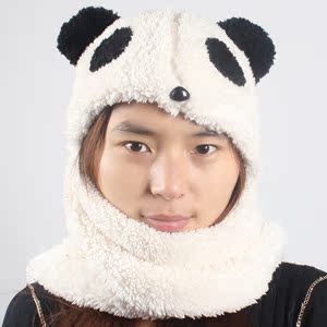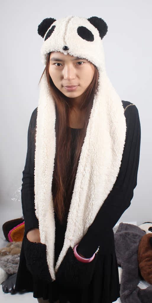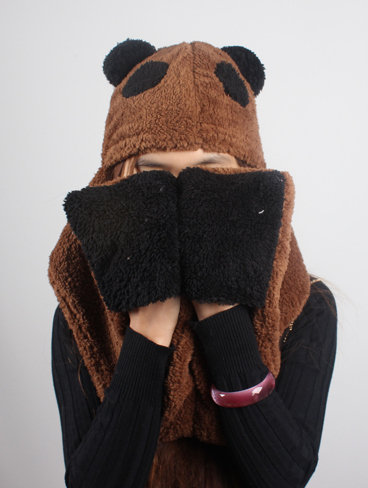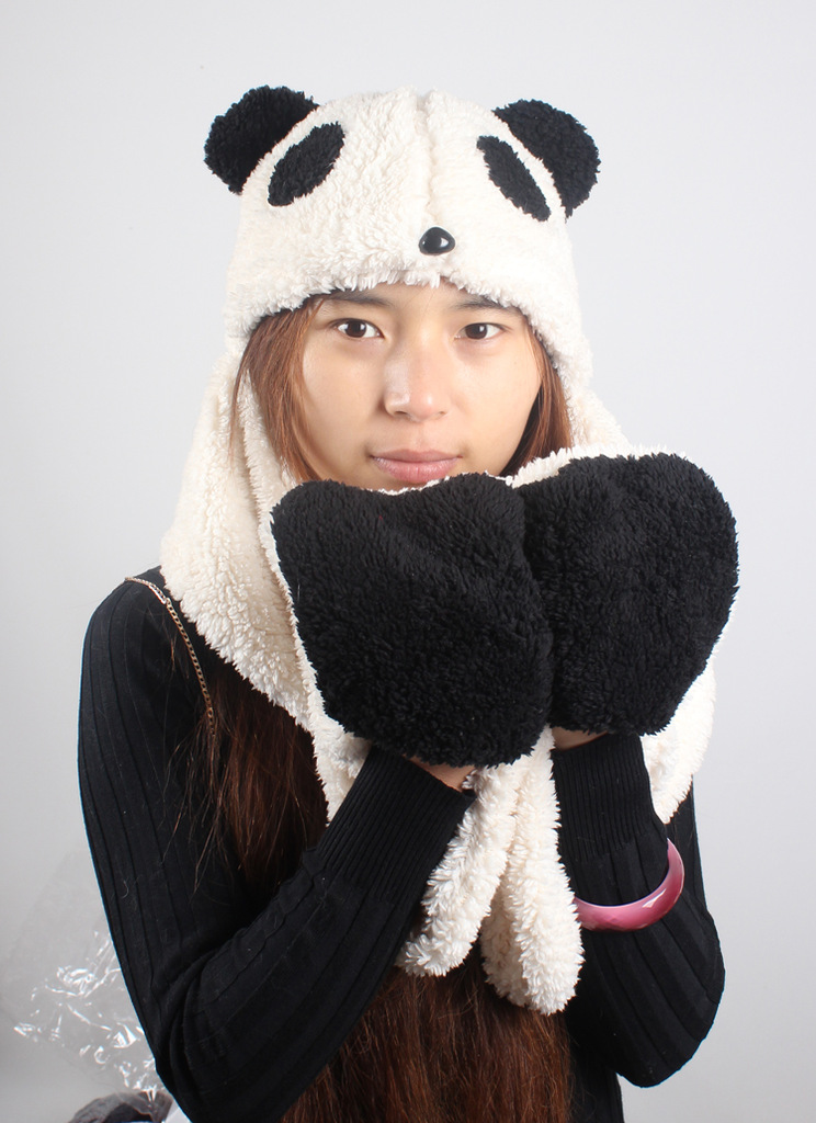 秋冬女士保暖围巾 可爱卡通熊猫动物款式帽子手套围巾连套装