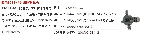 美国 泰康 Techcon TS918-46 四通管接头 点胶附件