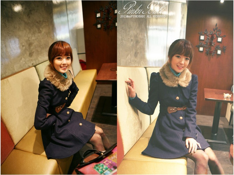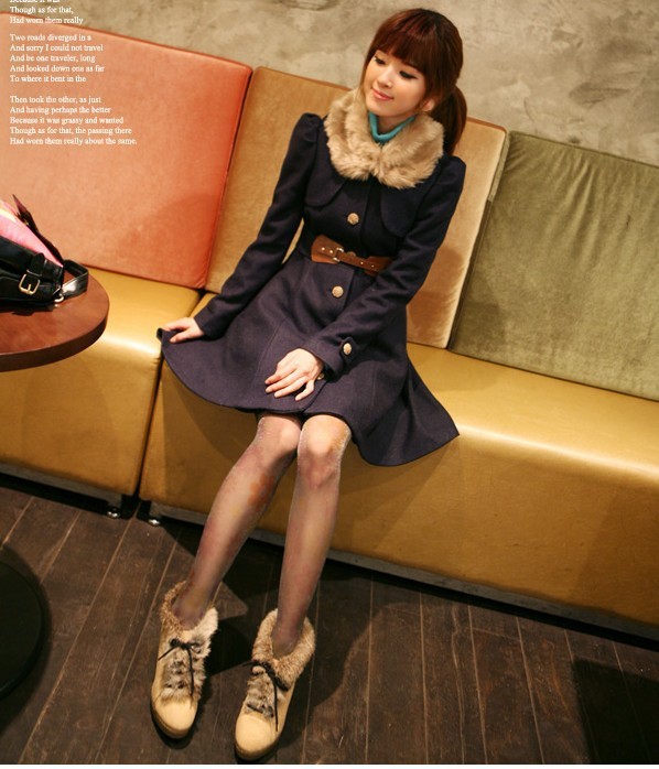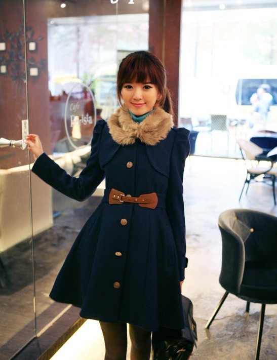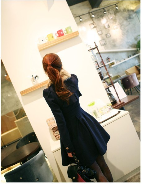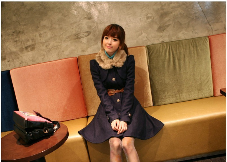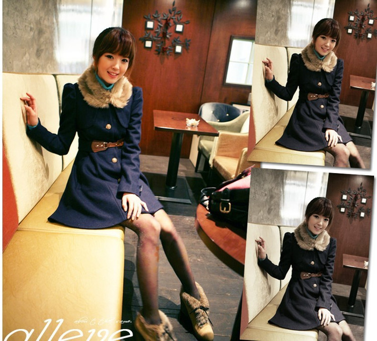 批发 韩国女装冬装毛毛领单排扣泡泡袖腰带收腰毛呢大衣外套797