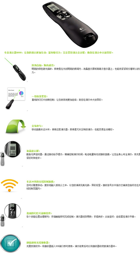 包邮 罗技 R800 无线演示器 直观的幻灯片 绿光 PPT激光笔
