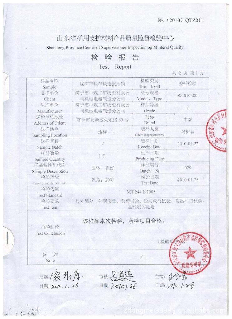 优质矿车销子有质量检验报告