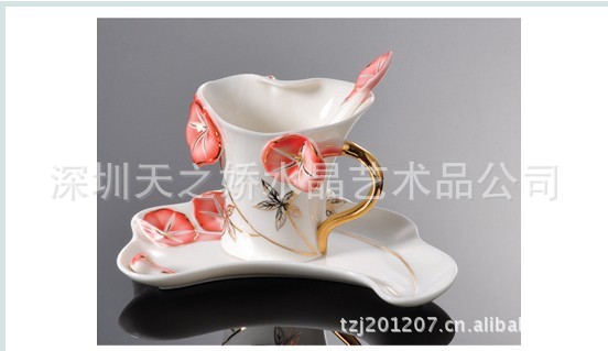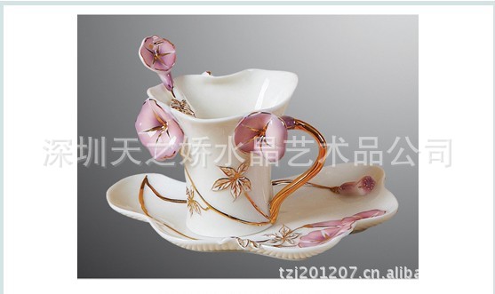 珐琅彩瓷炫金红、紫、蓝牵牛咖啡杯 (1杯1碟1匙)