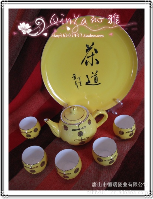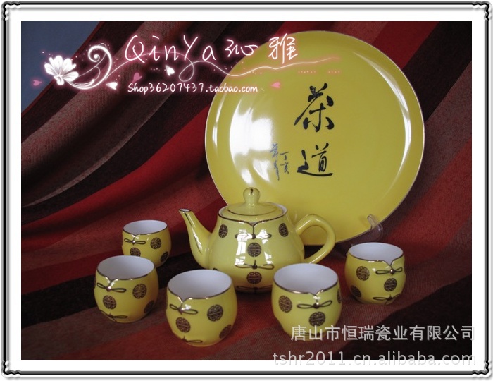 薄胎7头黄釉茶具套装 釉中彩 唐山优质骨瓷茶具批发