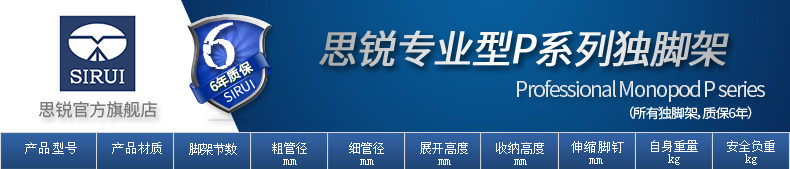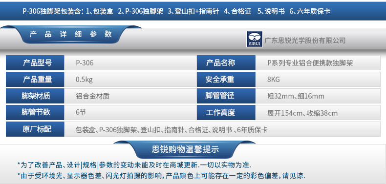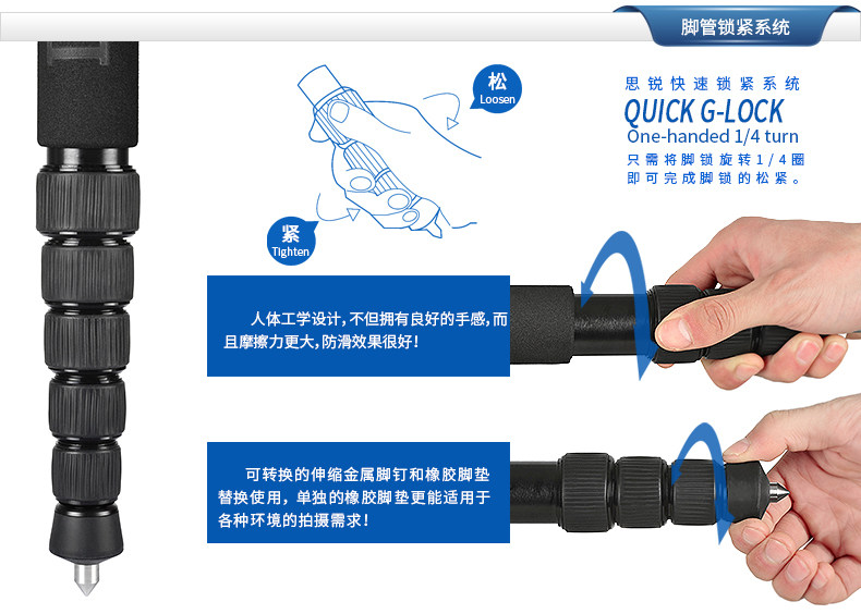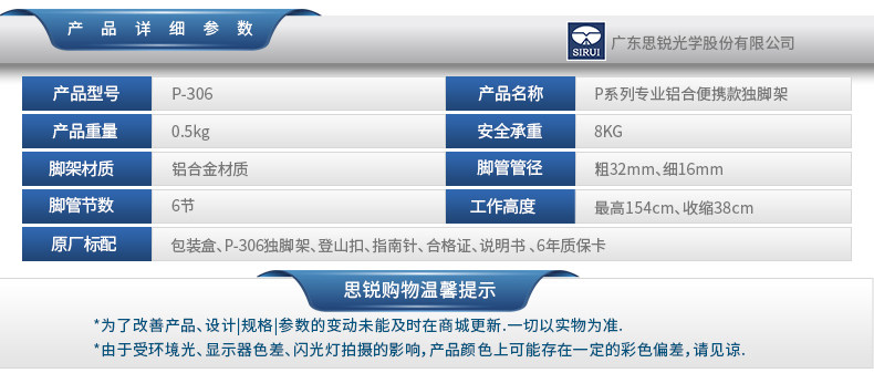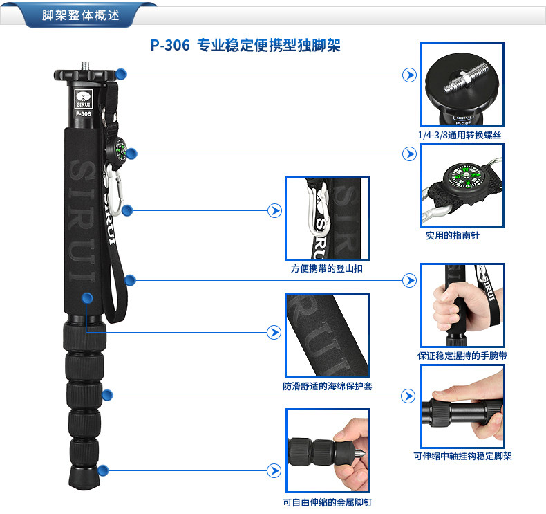 思锐独脚架 P306 单反相机旅行登山摄影摄像便携式铝合金脚架