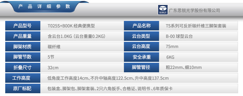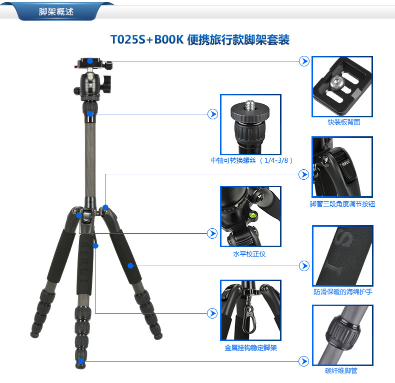 思锐T025SK+B00K碳纤维三脚架 微单旅行便携三角架云台套装